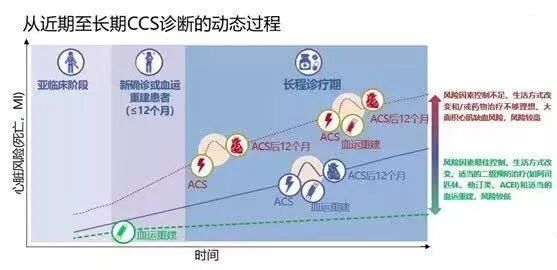 他说,指南强调心血管危险因素控制和改变生活方式,指出包括阿司匹林、他汀和ACEI等药物治疗不充分,或血运重建不成功,风险可能会增加。而合理二级预防和血运重建,可降低风险。指南还用一个漂亮的图表示,管理不好的患者可能发生急性冠脉事件。