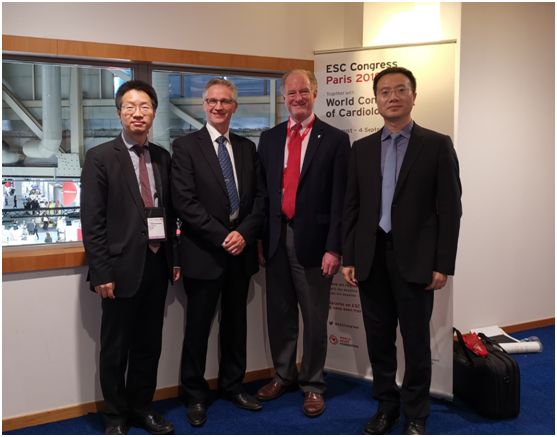 从右至左分别为唐熠达教授、Circulation主编Joseph A. Hill教授、CCS指南写作委员会主席Juhani Knuuti教授和杨进刚教授